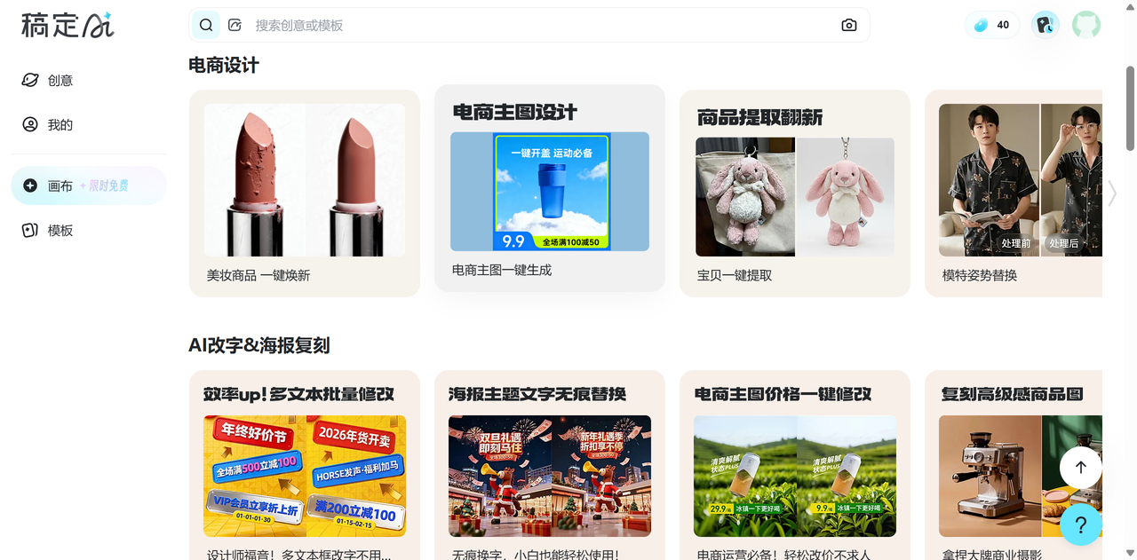 深度評測: 稿定設(shè)計不是一個純粹的Logo工具,而是一個綜合平面設(shè)計平臺。它的邏輯是“素材拼接”而非“從零創(chuàng)造”。它的Logo生成功能通常與海報制作深度綁定。例如,你生成了一個Logo,下一秒就可以把它拖進一張“雙11大促”的海報模板里。